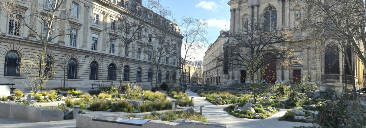Entre l’église Saint-Gervais et l’Hôtel de Ville, ce jardin mémoriel est dédié aux victimes des attentats du 13 novembre 2015. Il évoque les différents lieux touchés – salle de spectacles, bars, Stade de France– à l’aide de blocs de granit.